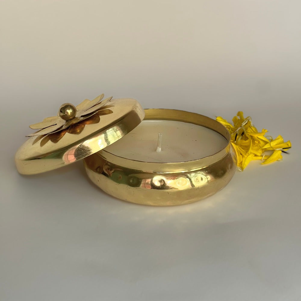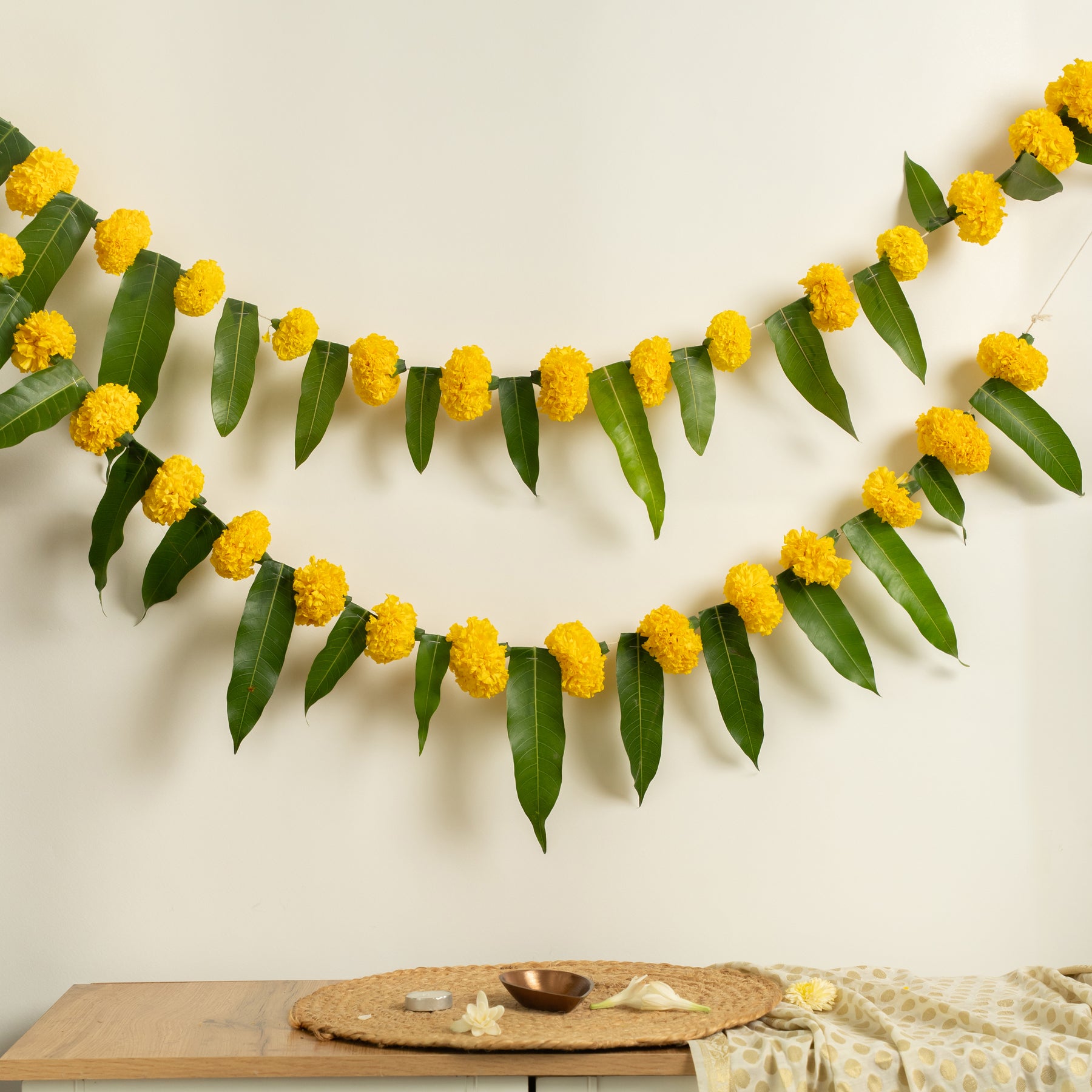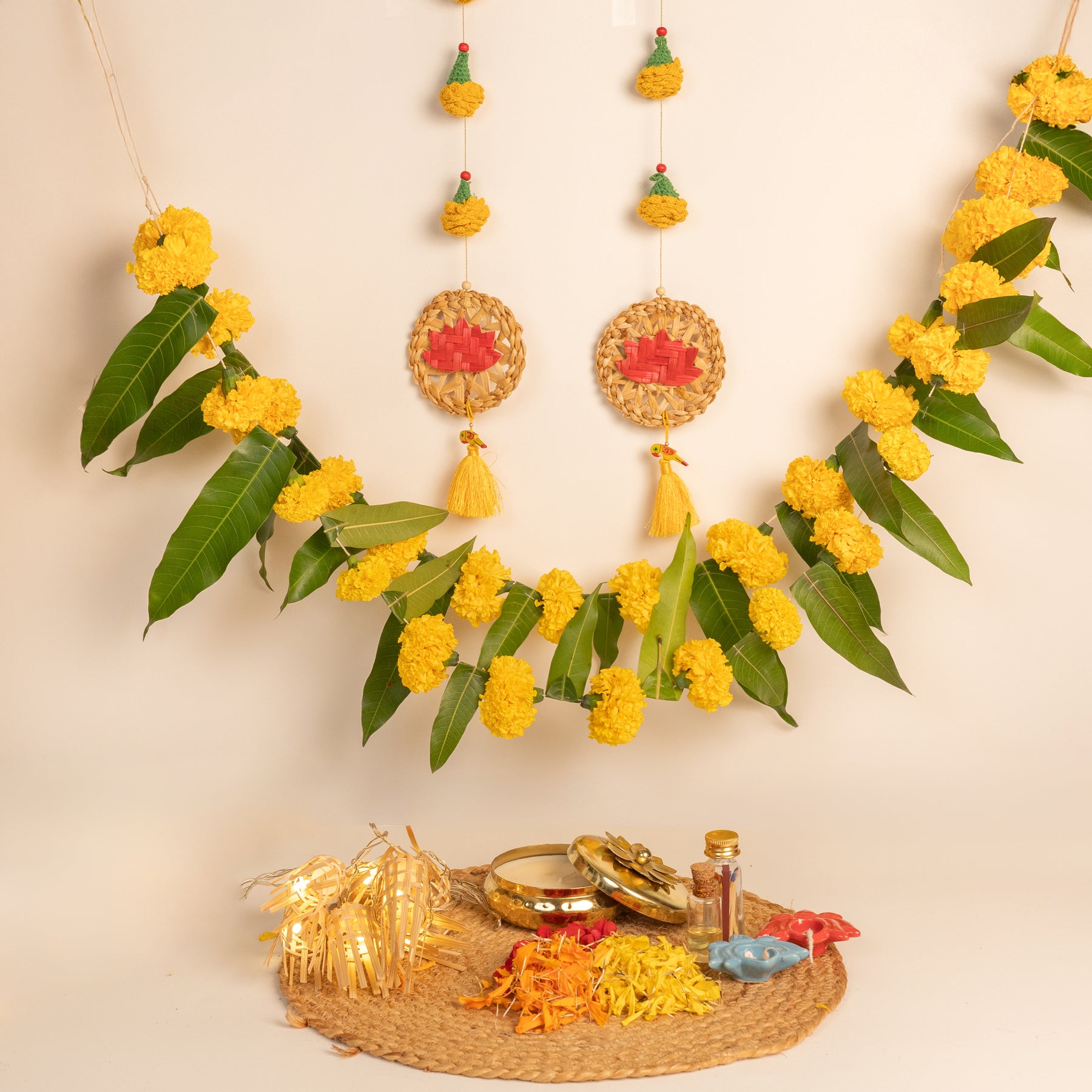 Includes: Marigold & mango leaf toran, Tim Tim lights, Urli candle, 2 Ceramic lotus diya with wick , Loose petals, Marigold - Lotus hanging string, Match box & Oil