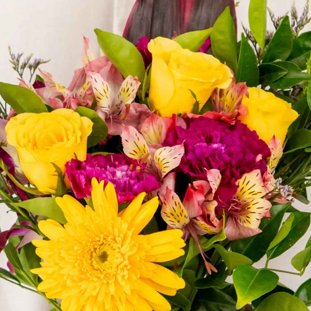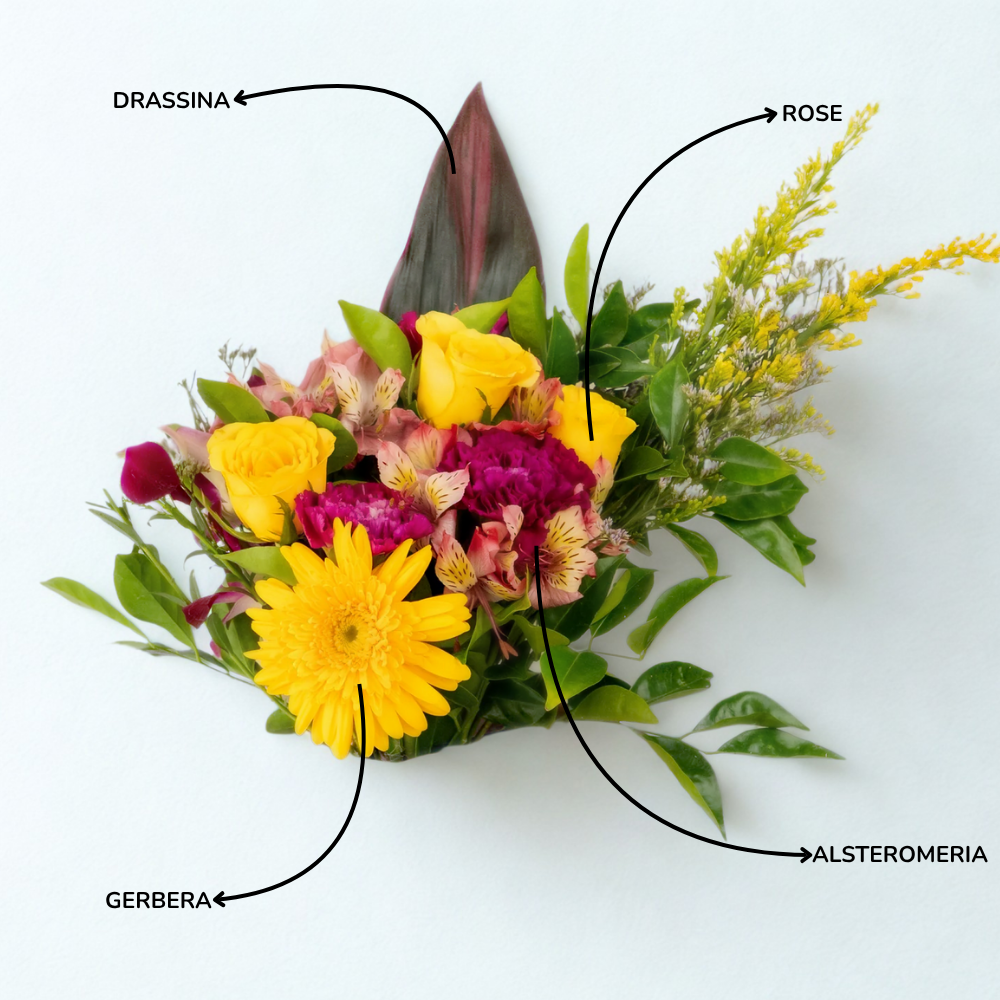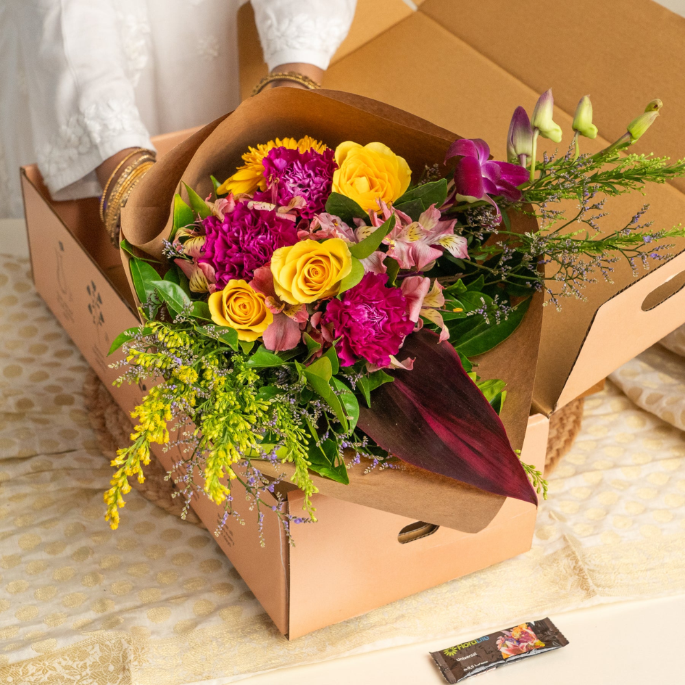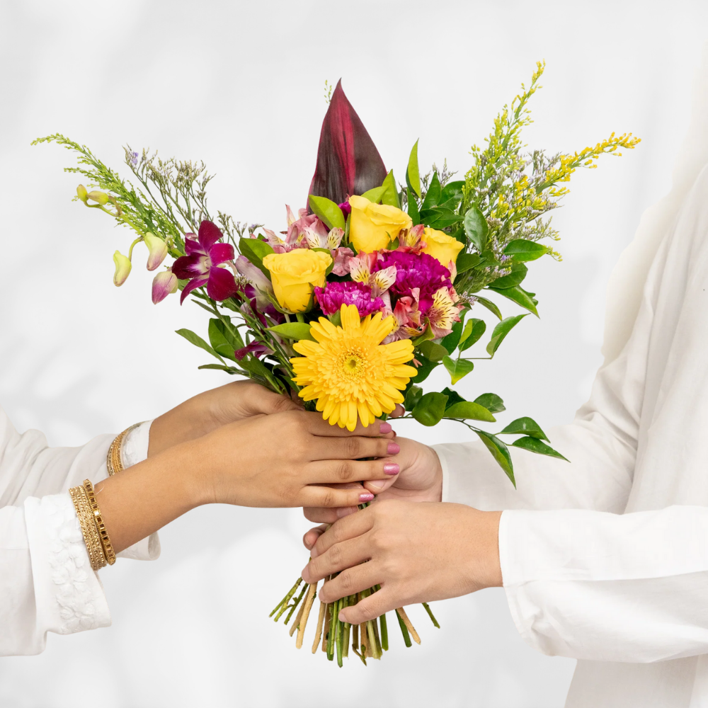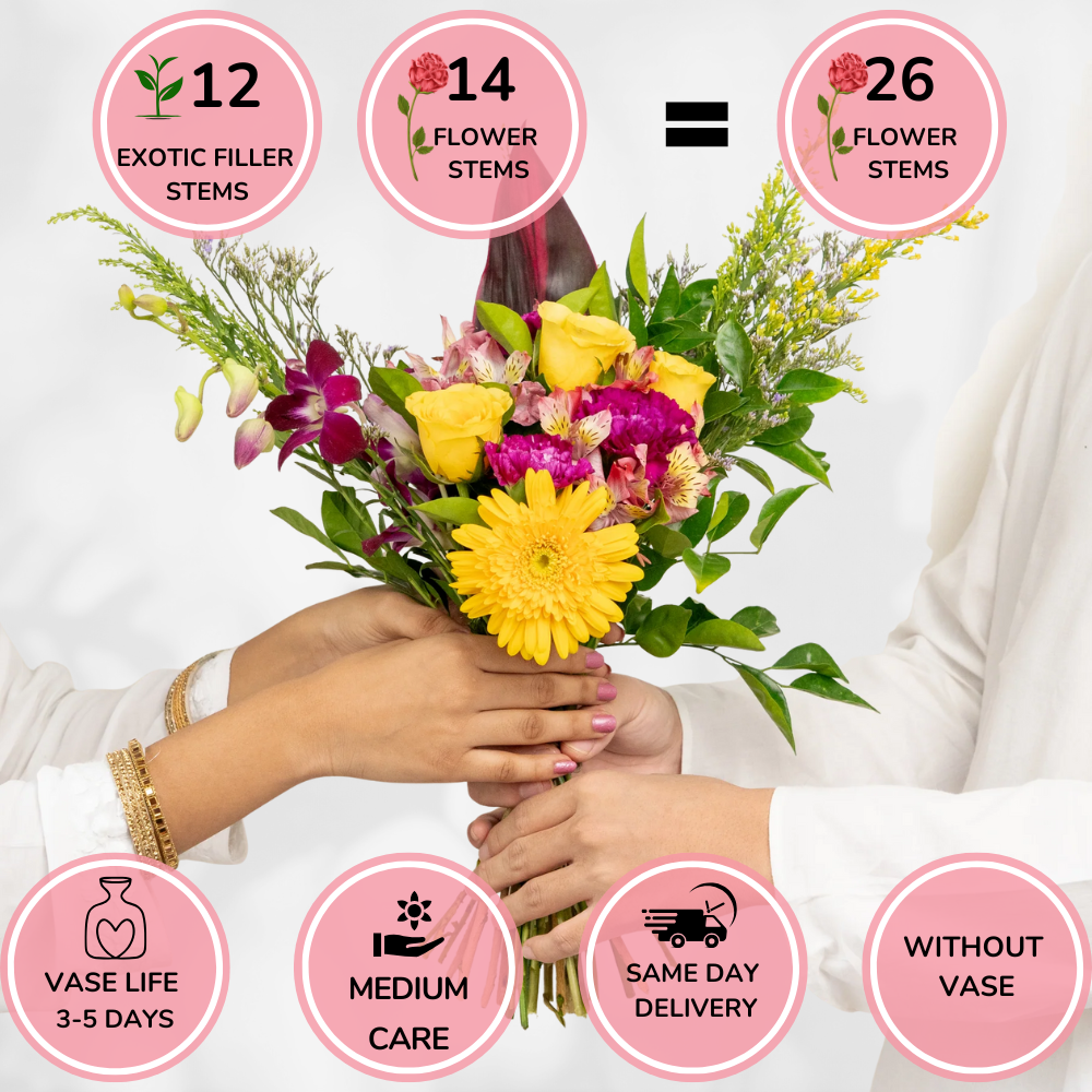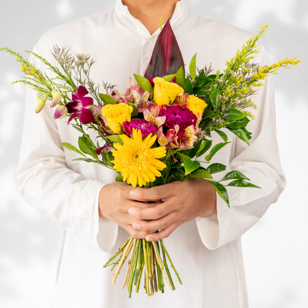 Celebrate the joyous occasion with our enchanting mini bouquet featuring Purple Orchids, Carnations, and Gerberas. The vibrant hues of these blooms beautifully complement the cherished bond between siblings, making this thoughtful gift a perfect expression of love and affection on this special day.