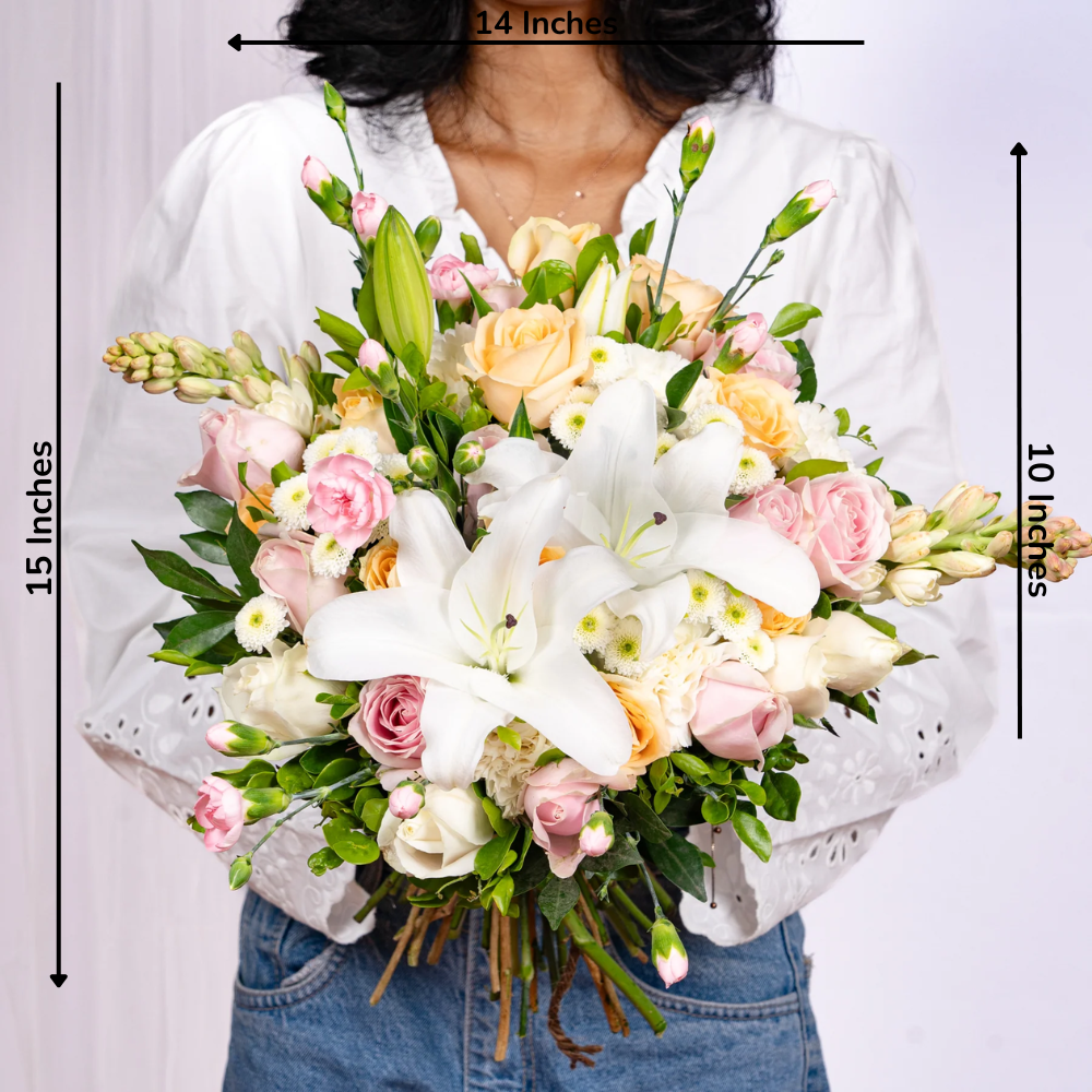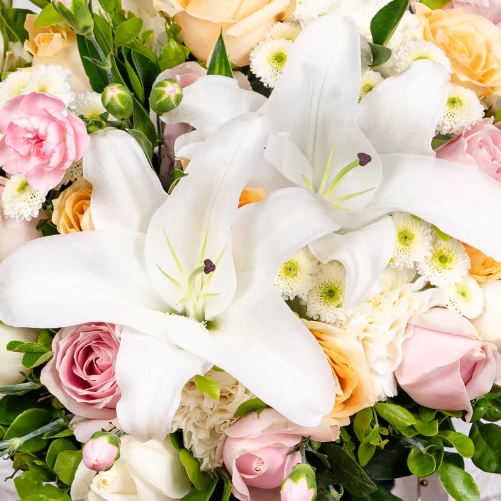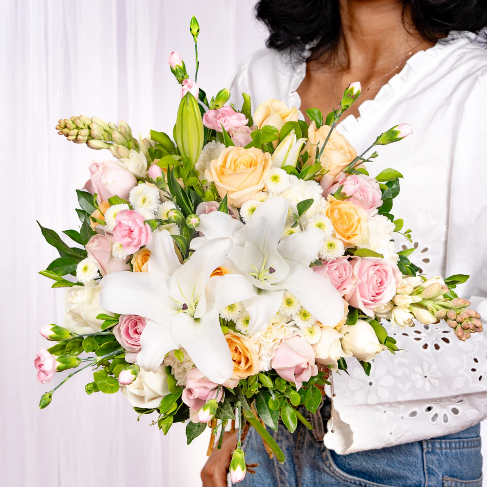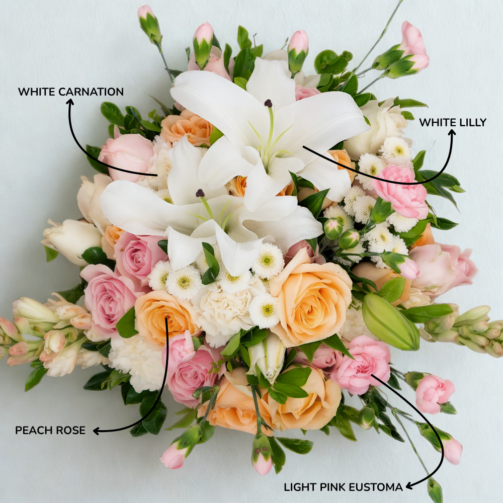A delicate blend of sweet roses, peach roses, white roses, white carnations, and calimeros, complemented by elegant lilies, light pink spray carnations, tuberose, and kamini. A breathtaking bouquet to celebrate love and beauty this Valentine’s Day.