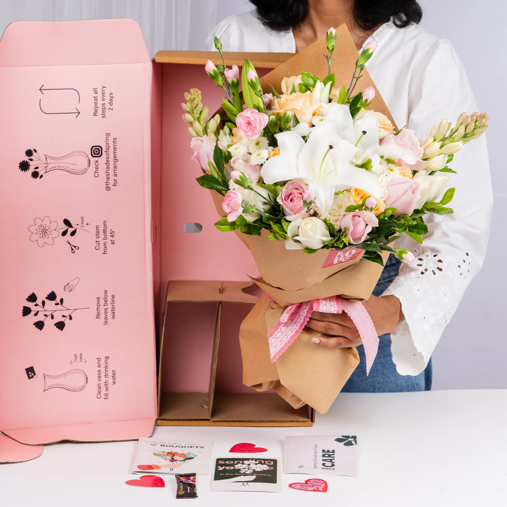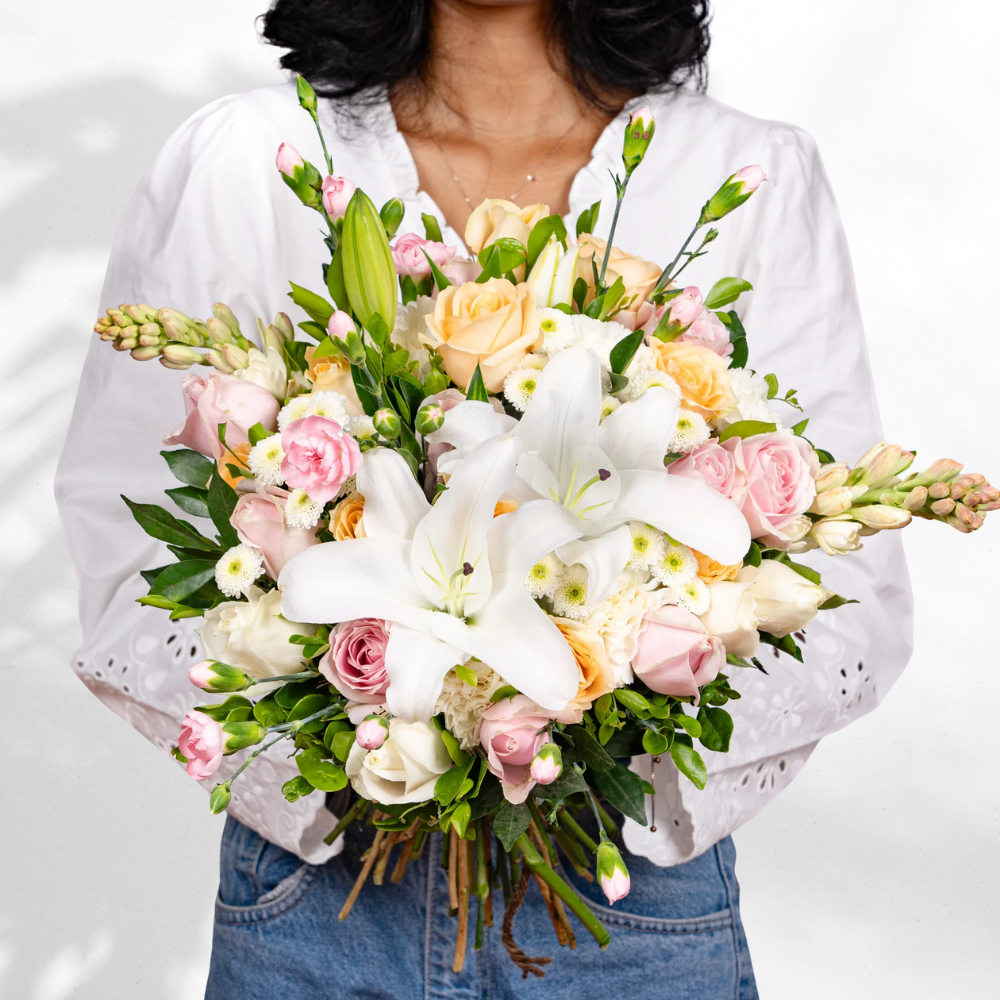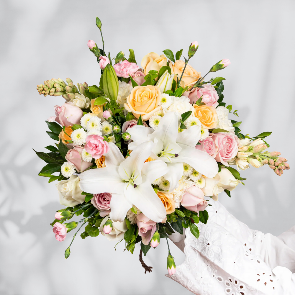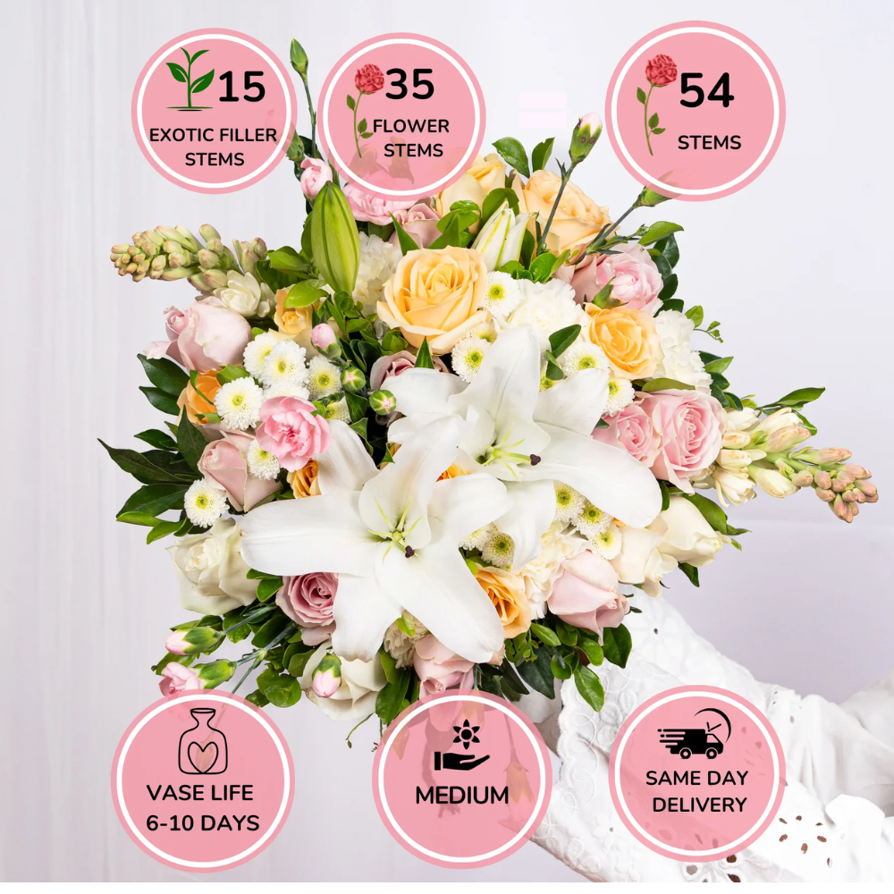 A delicate blend of sweet roses, peach roses, white roses, white carnations, and calimeros, complemented by elegant lilies, light pink spray carnations, tuberose, and kamini. A breathtaking bouquet to celebrate love and beauty this Valentine’s Day.