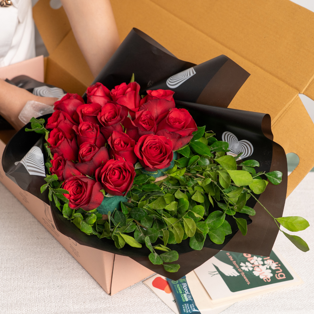 A dramatic expression of love, Midnight Valentine pairs the passion of red roses with the mystery of midnight tones. Wrapped in black with playful heart motifs, this bouquet is made for grand gestures and unforgettable moments. Each bloom speaks of desire, devotion, and the thrill of romance after dark, perfect for Valentine’s Day or any night that deserves a little magic.