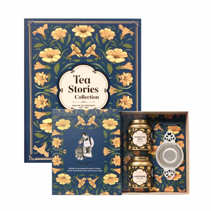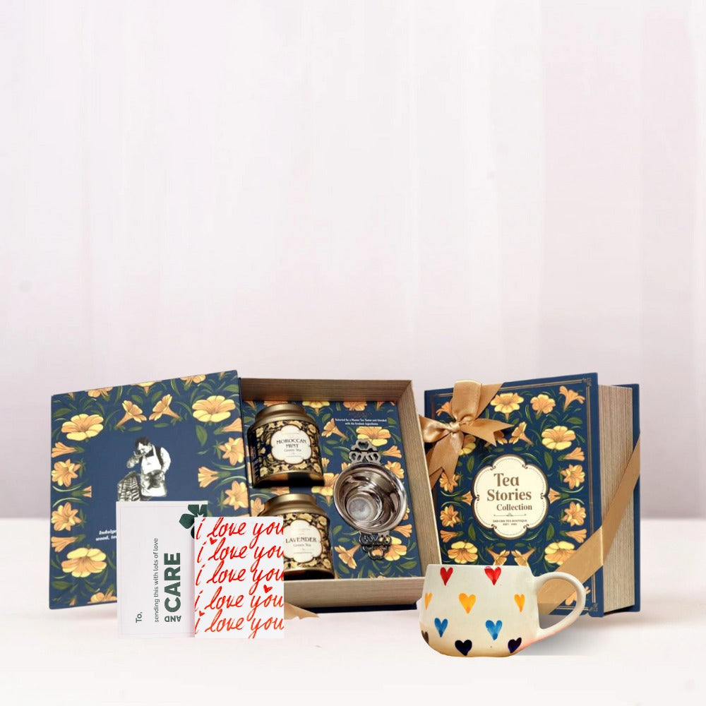 Includes : Tea stories collection, Hand painted rainbow cup, I love you card.