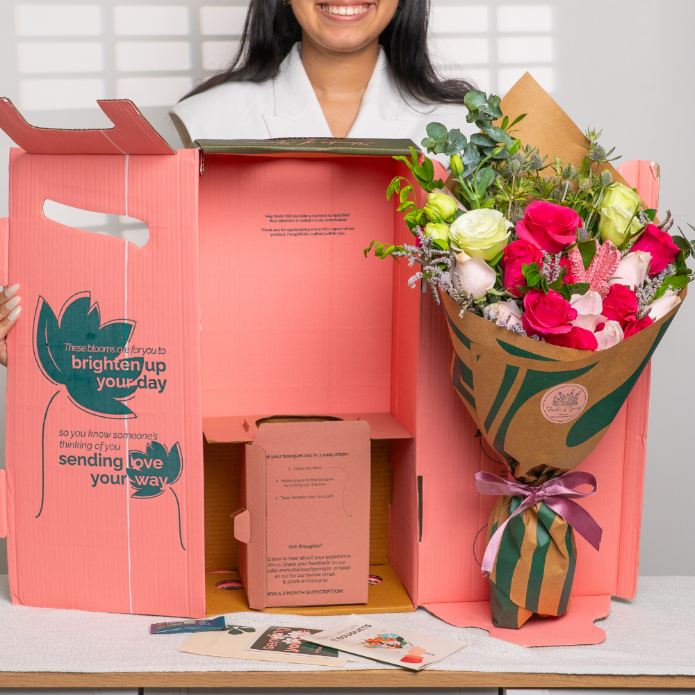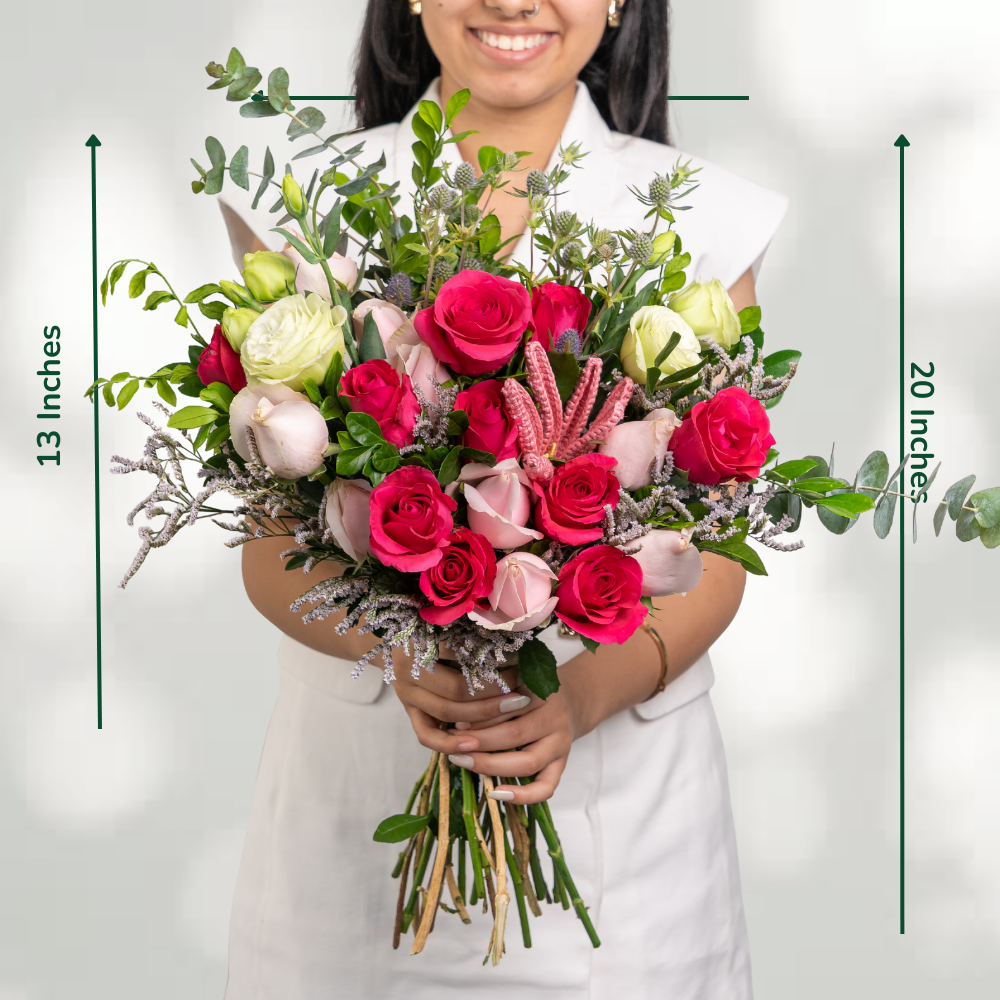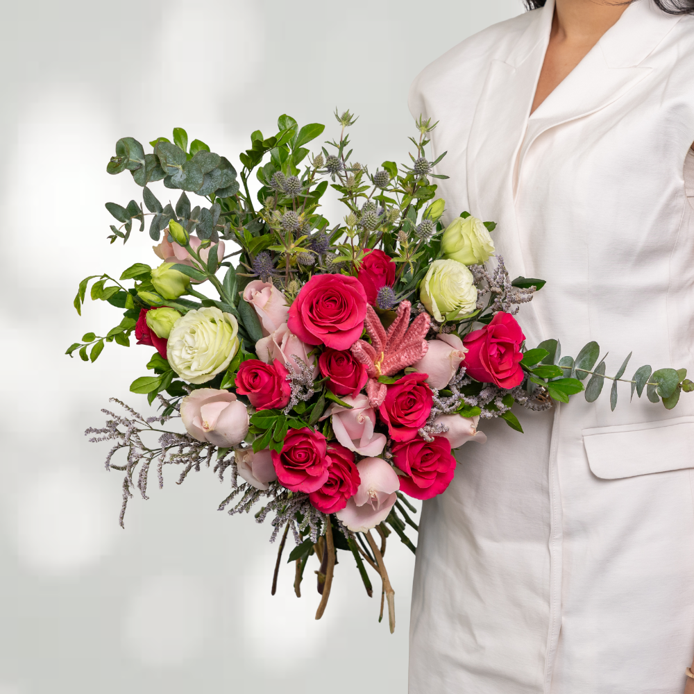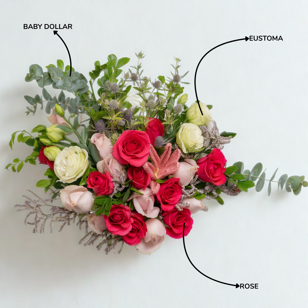 A tender vow captured in blooms, Pinky Promise is a bouquet that radiates affection and trust. With soft pink roses, delicate carnations, and lush accents, it embodies the sweetness of love’s most cherished promises. Perfect for Valentine’s Day, anniversaries, or simply to say “I’ll always be here”, this arrangement is a heartfelt symbol of devotion wrapped in elegance.