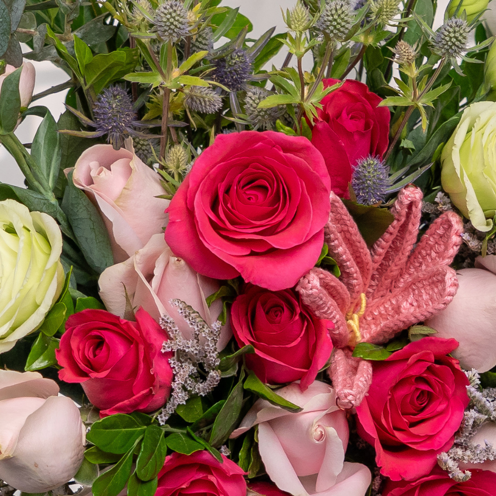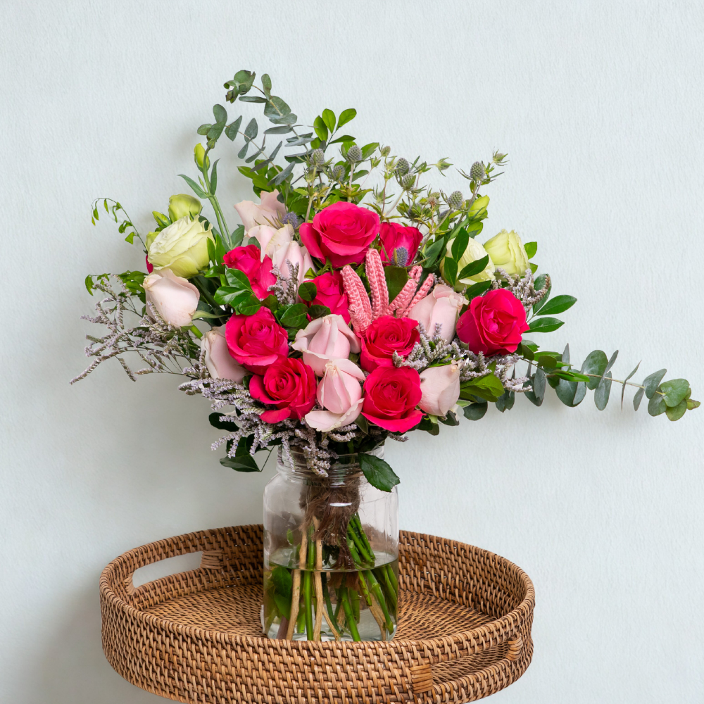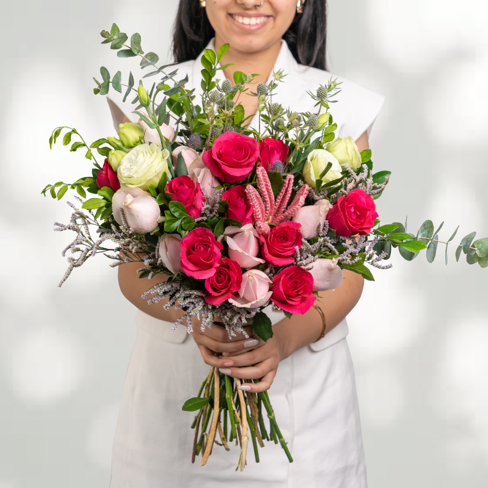 Sweet Avalanche Roses and Hot Shot Roses paired with fresh Green Eustoma, textured Eryngium, soft Limonium, Baby Dollar foliage, and fragrant Kamini leaves.