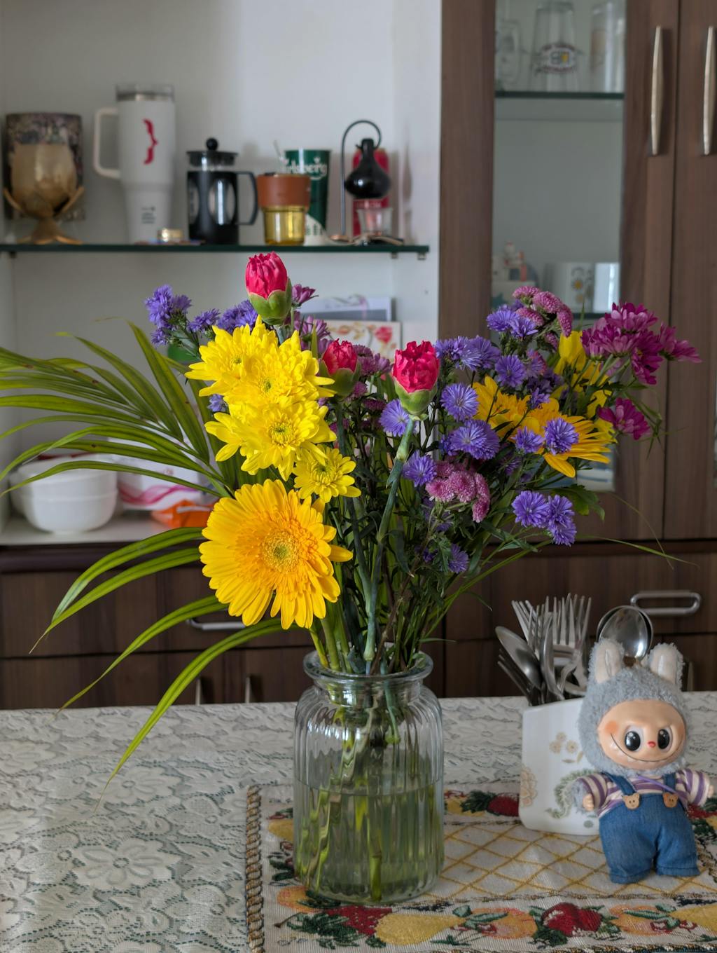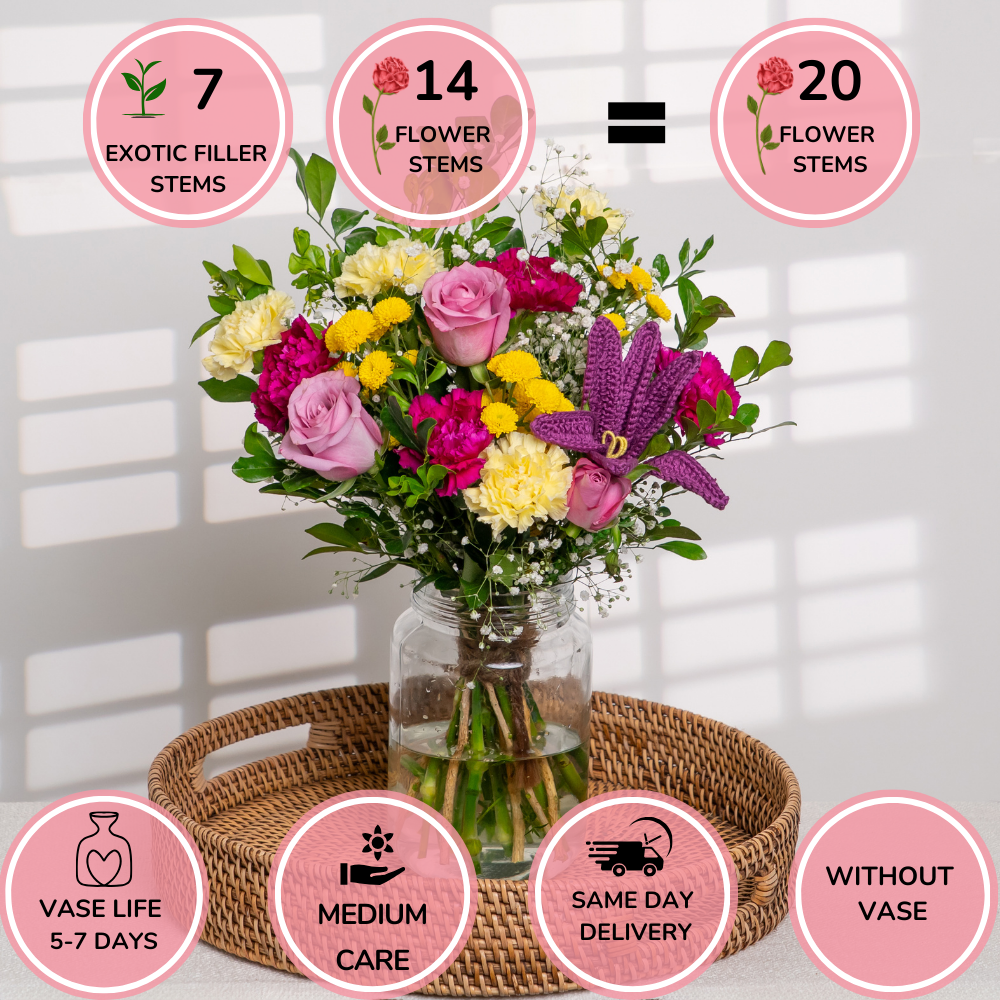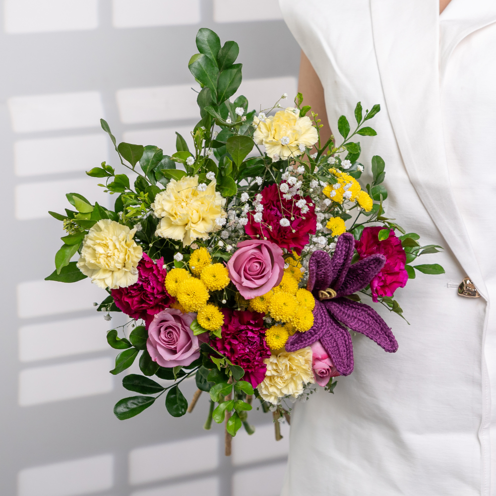 This is a bouquet that celebrates love in vibrant hues. With deep magenta, pink roses, chrysanthemums, and a striking purple lily, this arrangement is a symphony of color and emotion. Accented with lush greens and delicate fillers, it evokes passion, creativity, and heartfelt affection , a perfect gift for Valentine’s Day or any moment that deserves a muse.