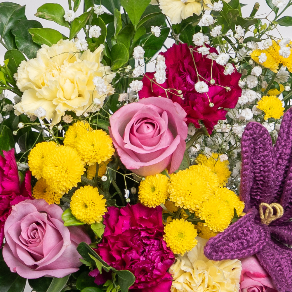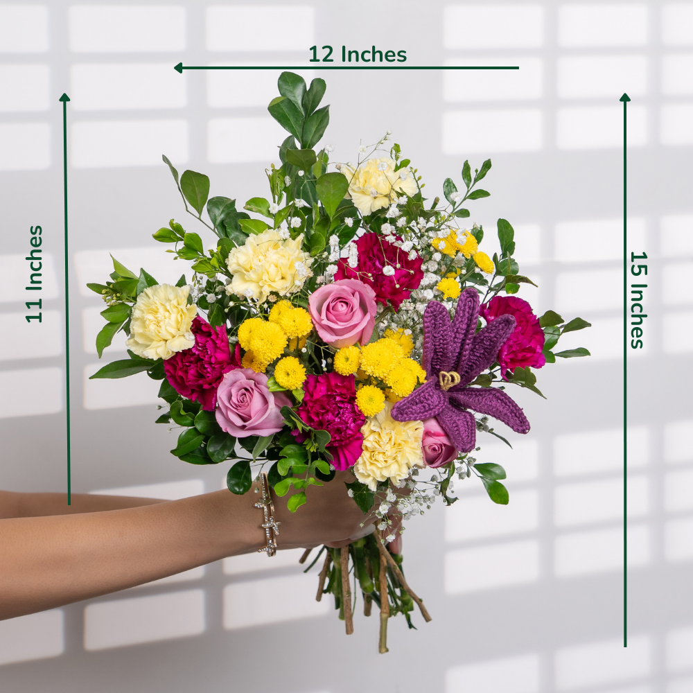 Purple Carnations, Yellow Carnations, Purple Roses, Yellow Calimero, and delicate White Gypsophila, finished with fresh Kamini