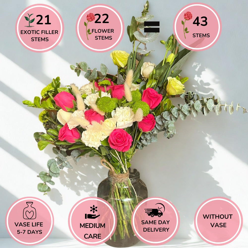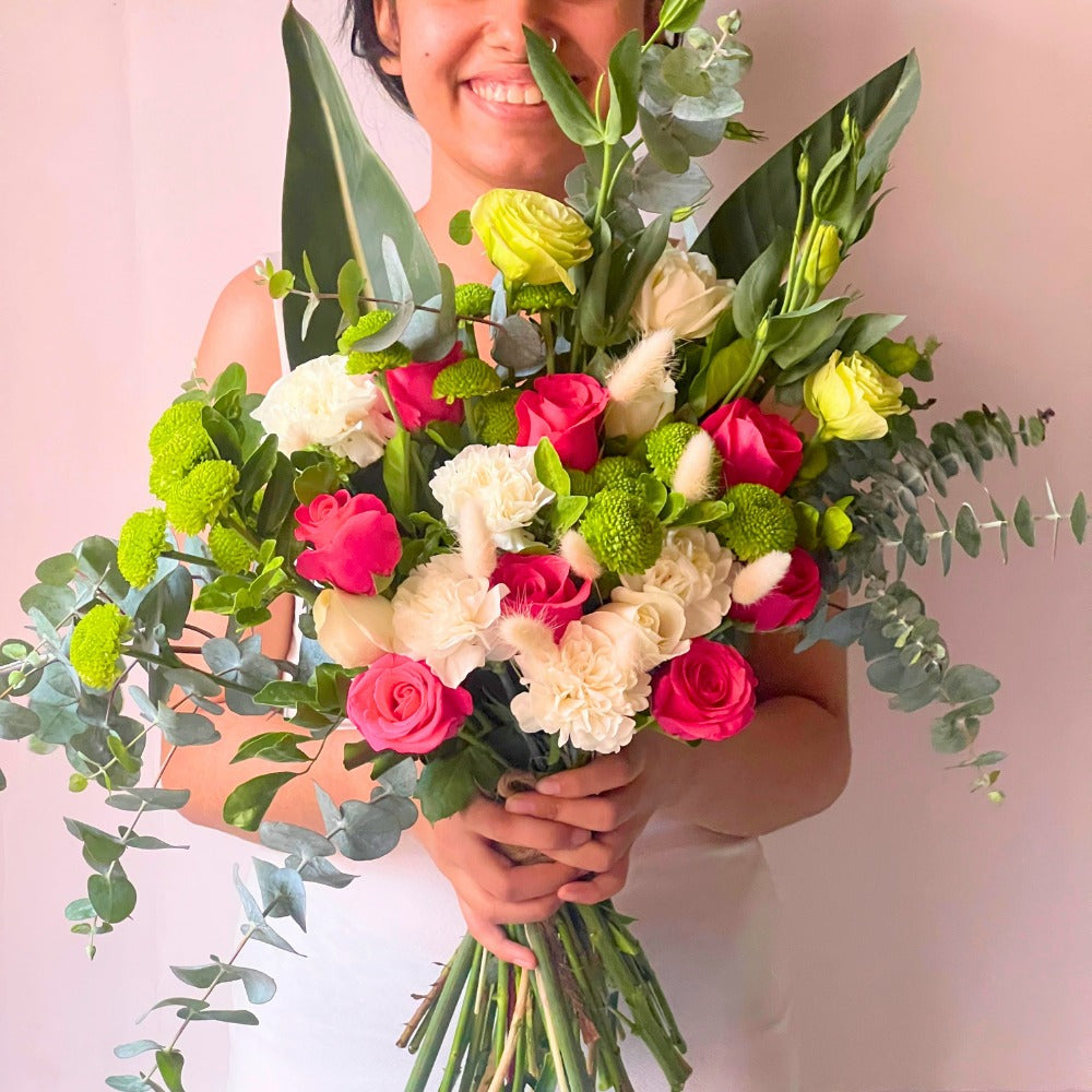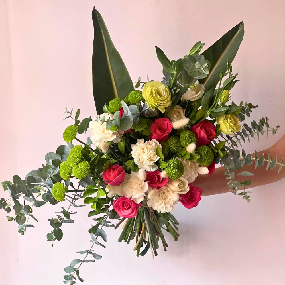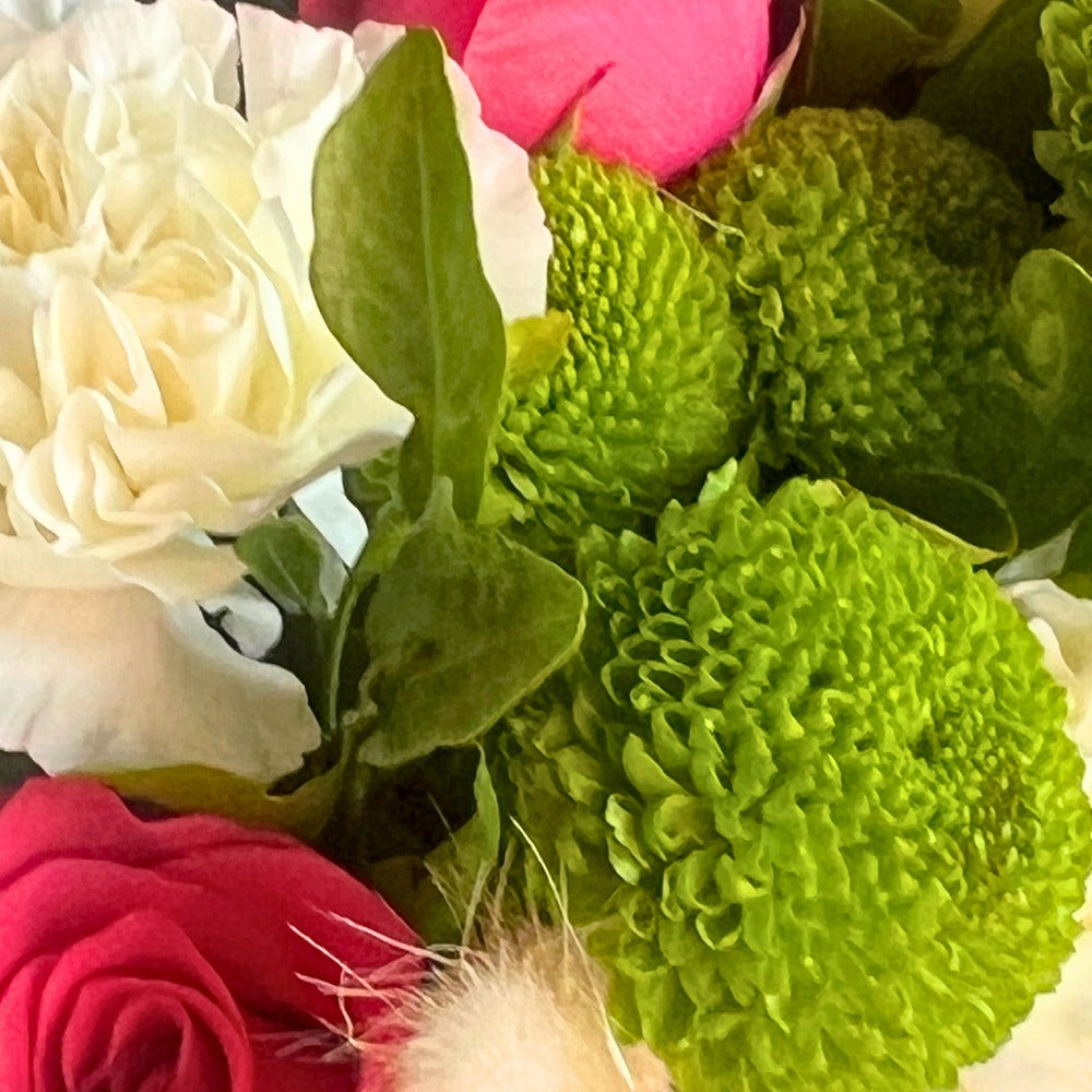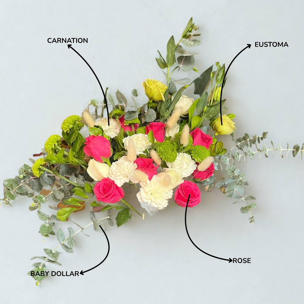 Green Button, Green Eustoma, Hotshot Rose, White Rose, White Carnation, White Bunny Tail, Baby Dollar, BOP Leaves, Kamini