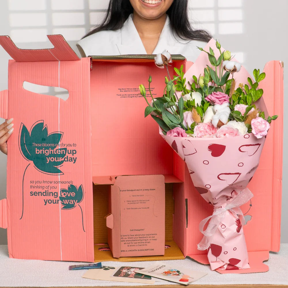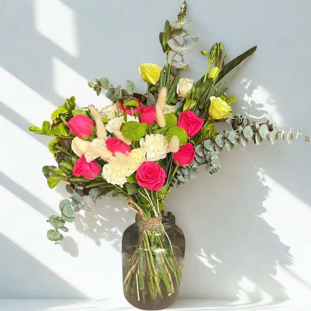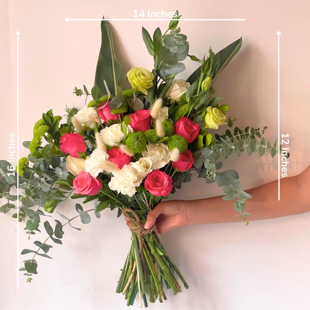 This bouquet is designed to bring a sense of calm, warmth, and quiet elegance. Featuring delicate blooms paired with lush foliage, it creates a naturally graceful arrangement that feels both refreshing and timeless.