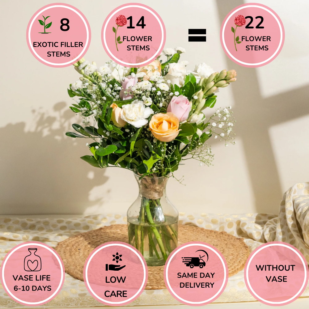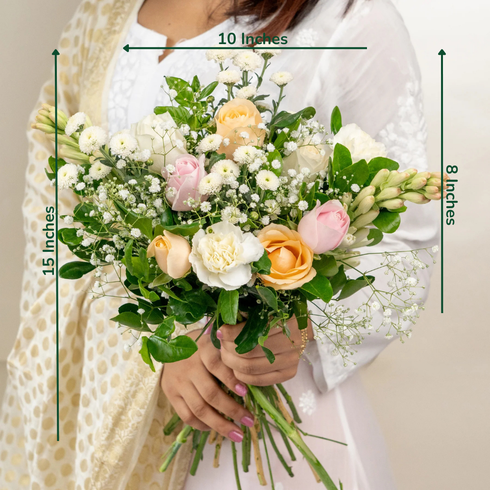 Experience the tranquility of pastel hues with our enchanting bouquet. Each bloom is delicately arranged to evoke feelings of serenity and bliss. Perfect for any occasion, our pastel bouquet brings a gentle glow and radiant serenity to brighten any day.
