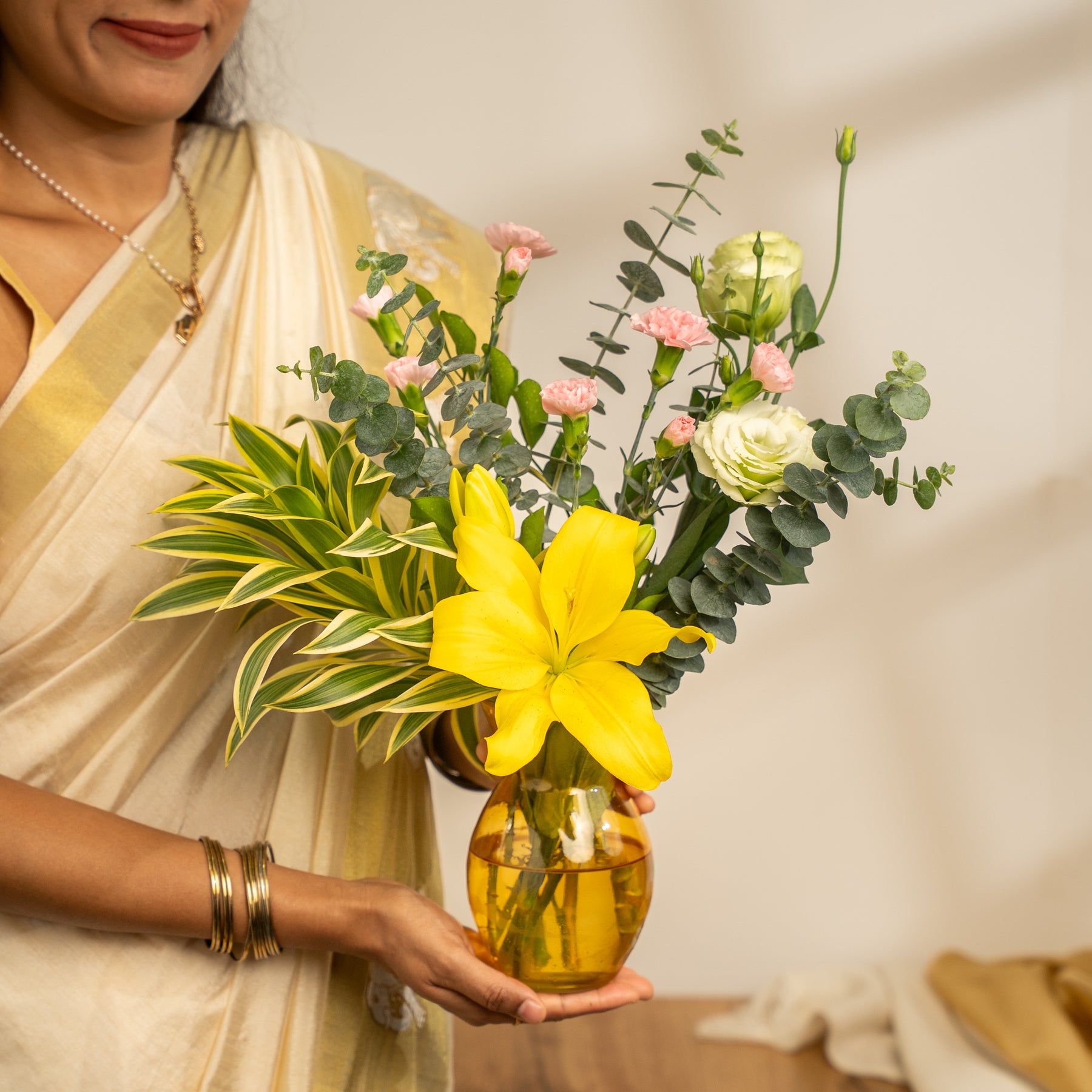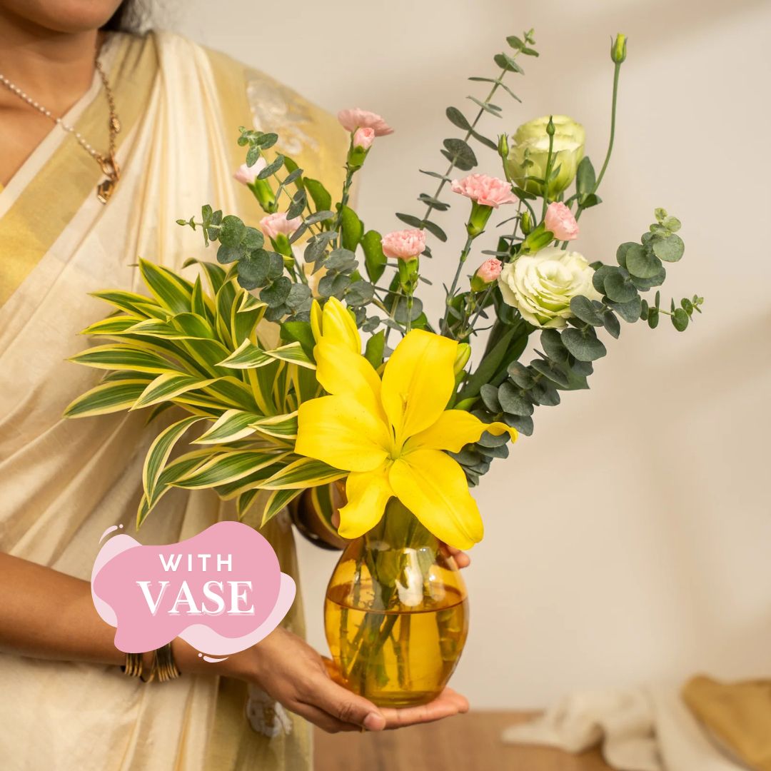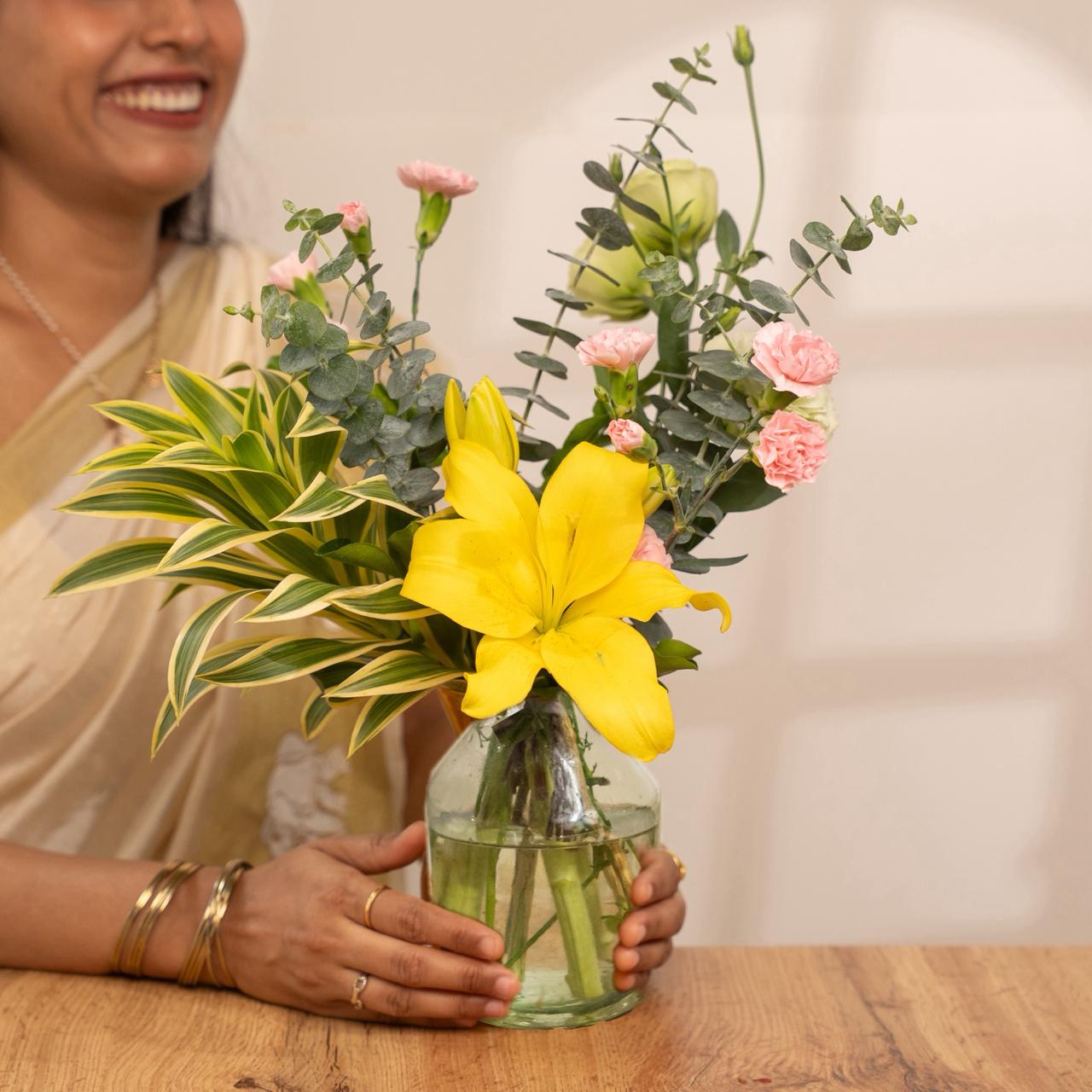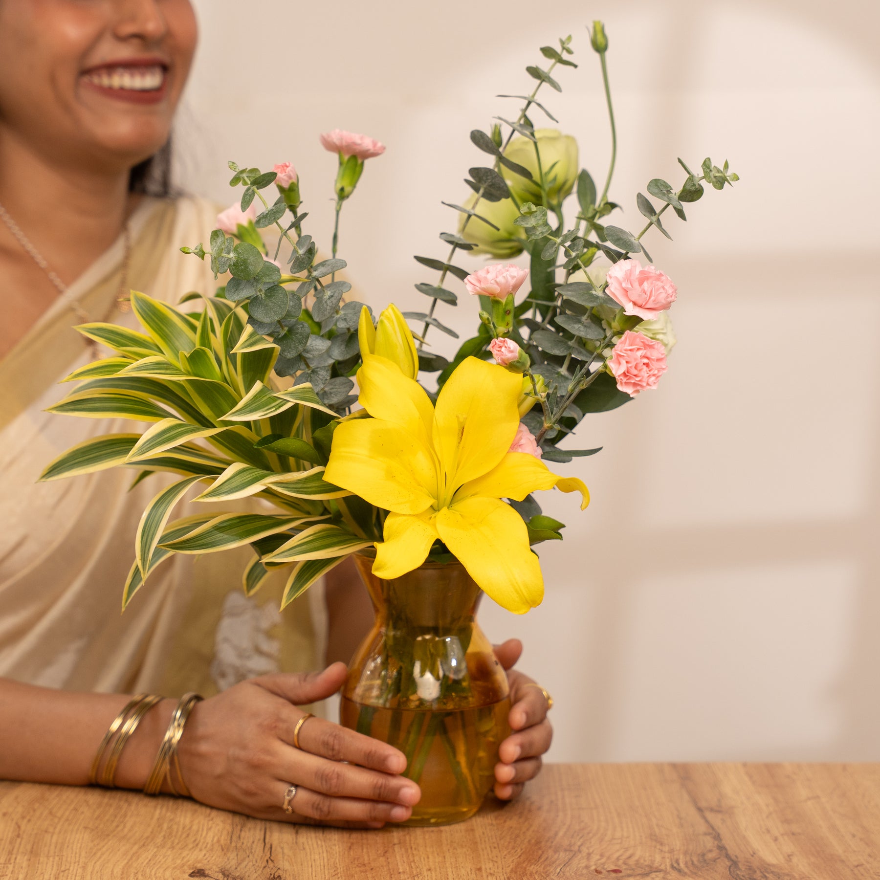An elegant ensemble of fresh blooms harmoniously arranged and gracefully cradled in a stylish vase. This floral serenade captures the poetry of nature, bringing beauty, warmth, and charm to any celebration or space.