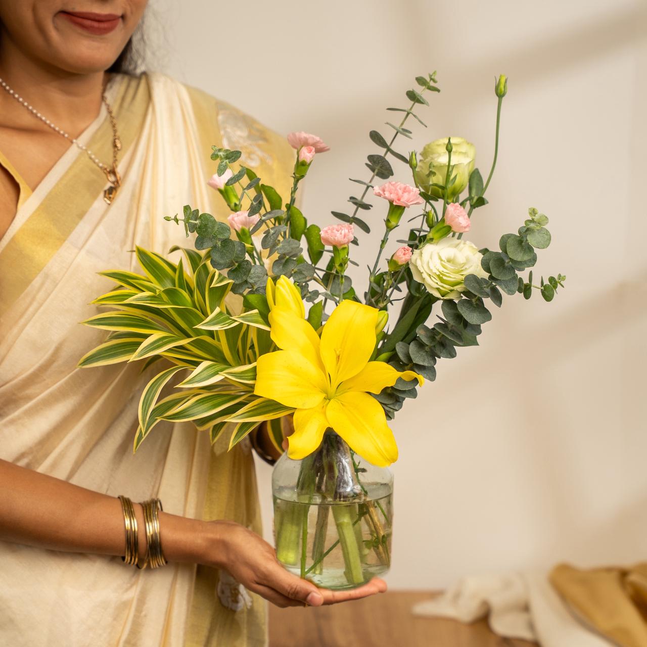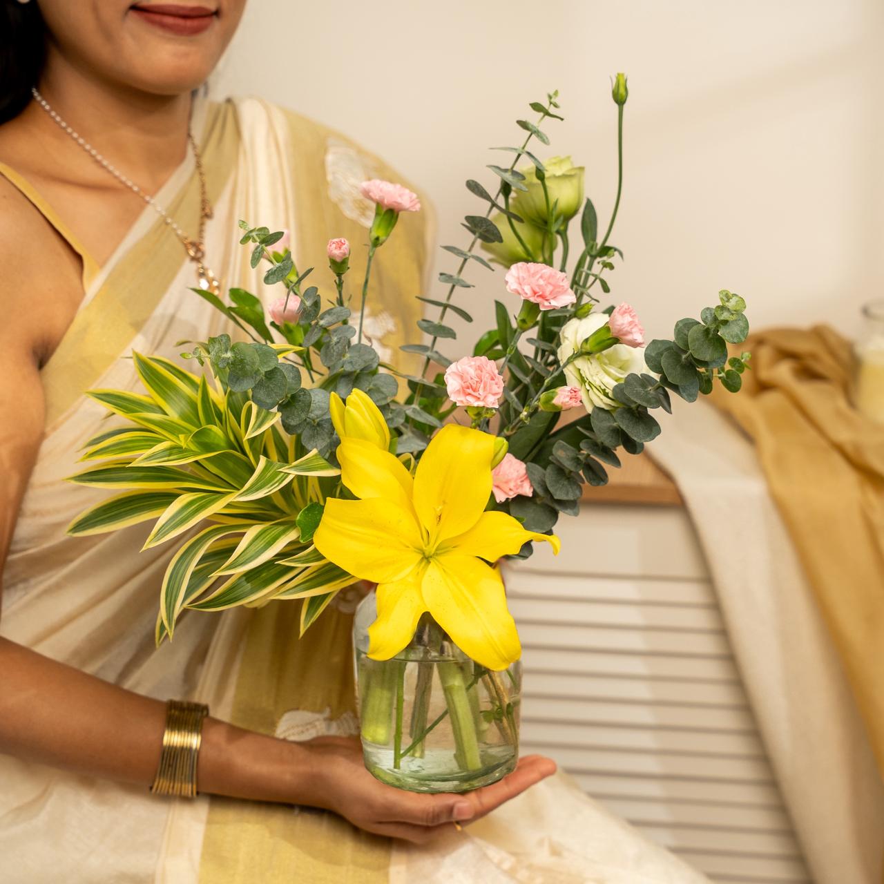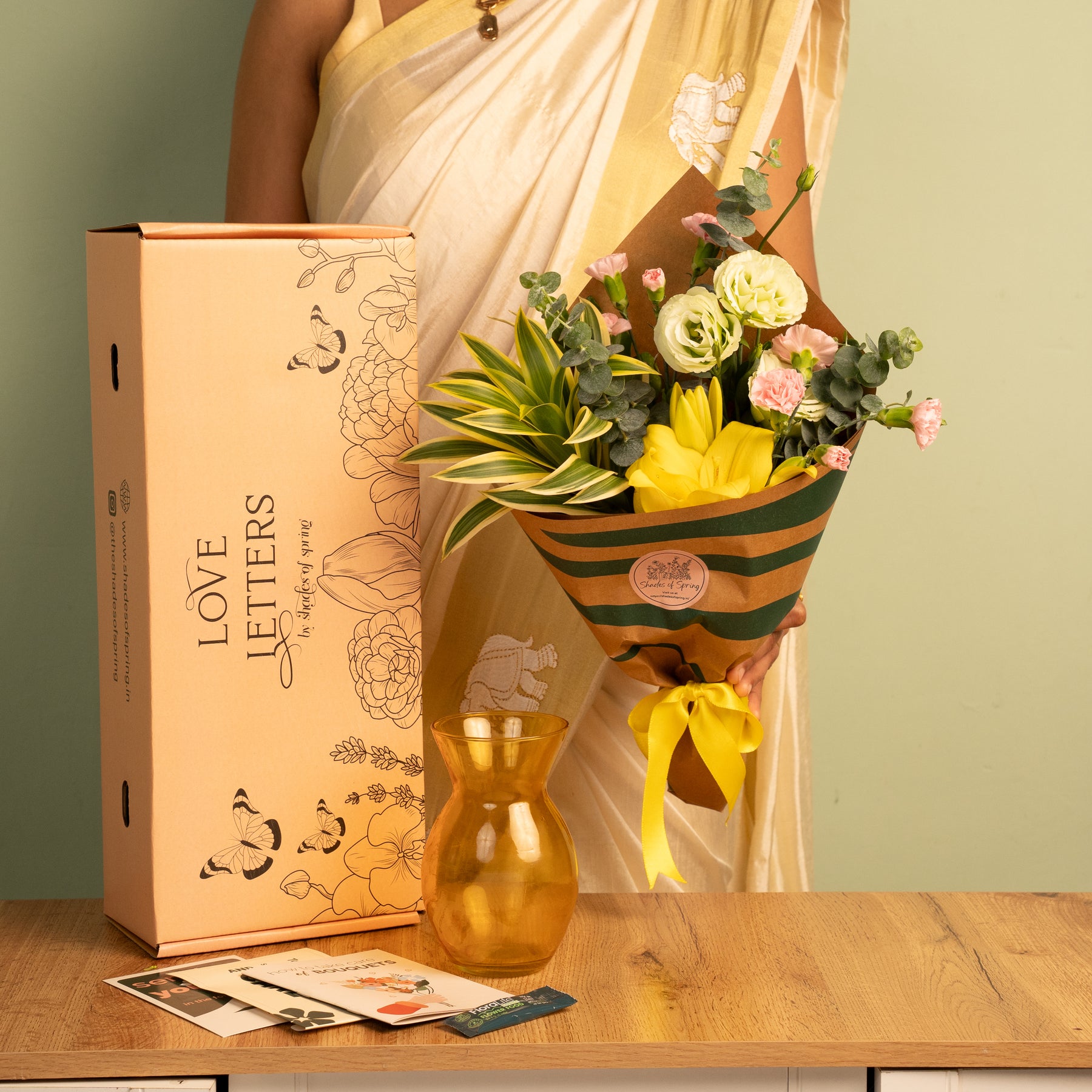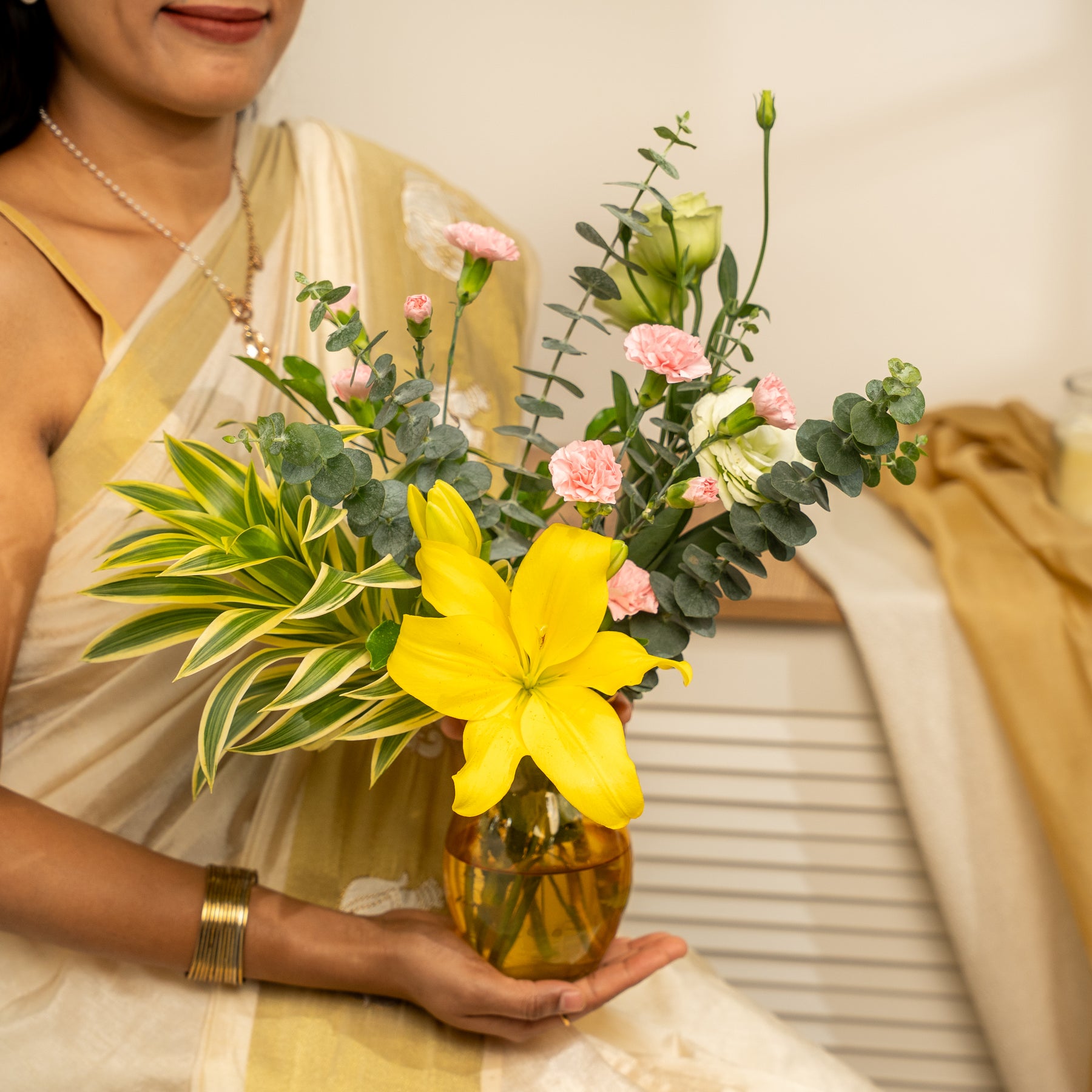 An elegant ensemble of fresh blooms harmoniously arranged and gracefully cradled in a stylish vase. This floral serenade captures the poetry of nature, bringing beauty, warmth, and charm to any celebration or space.