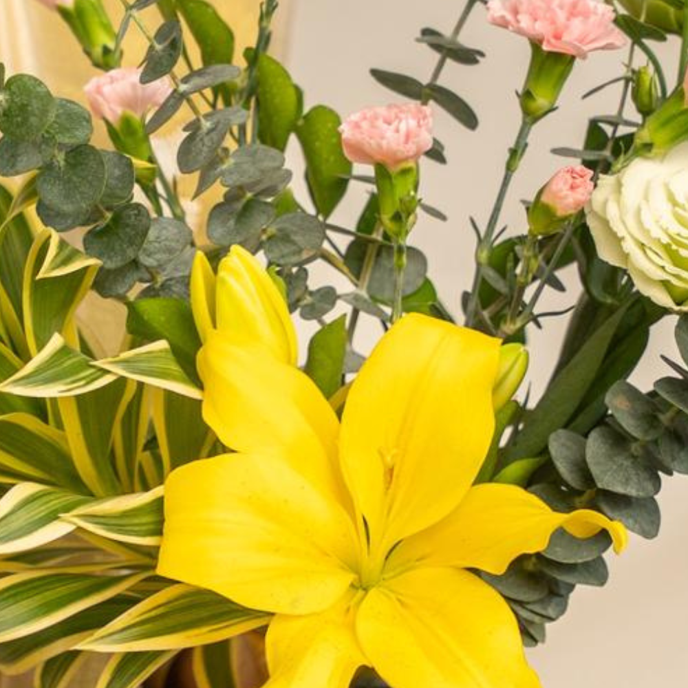 Types of flowers: Yellow Asiatic, Green Eustoma, Light Pink Spray Carnation, Song of India, Baby Dollar, and Kamini