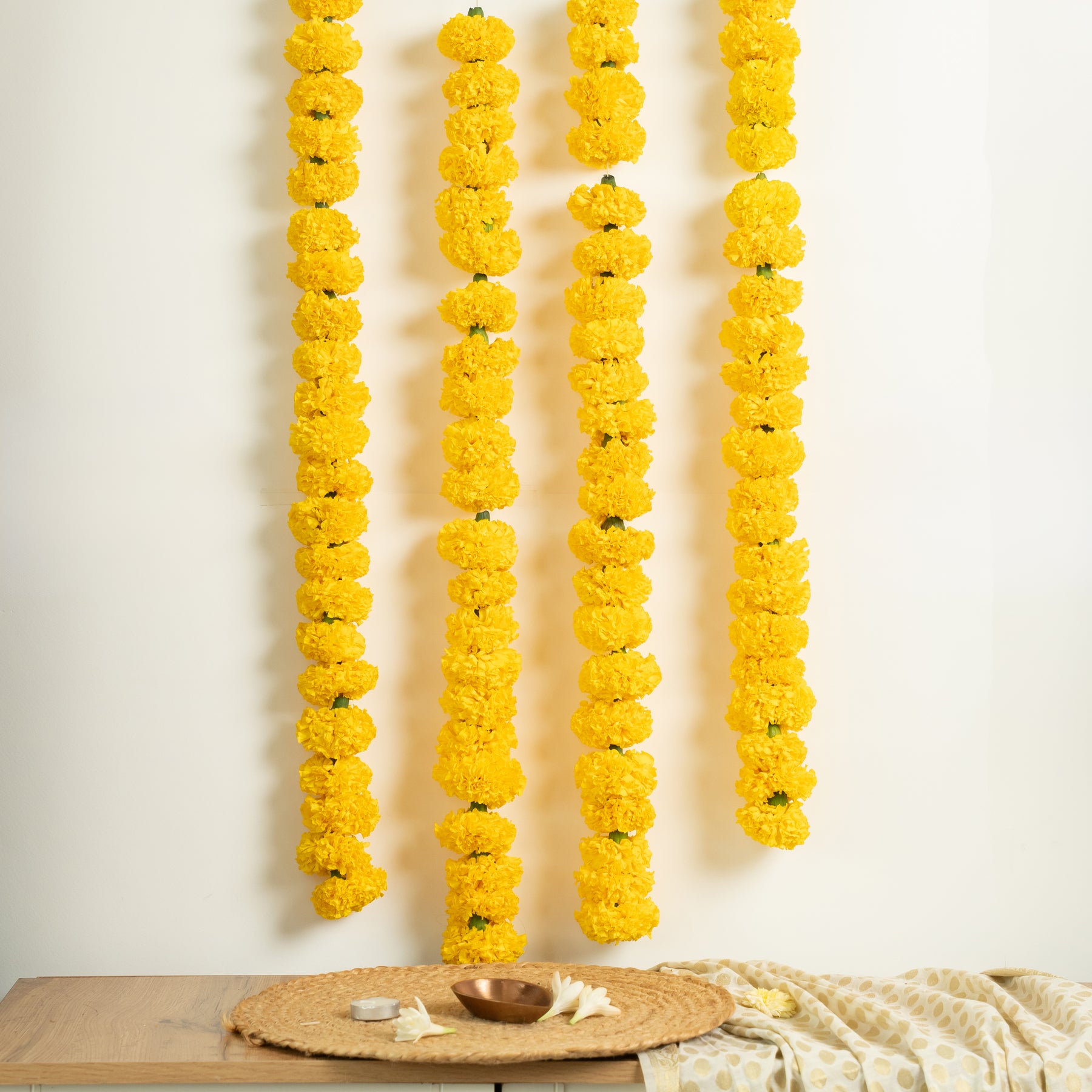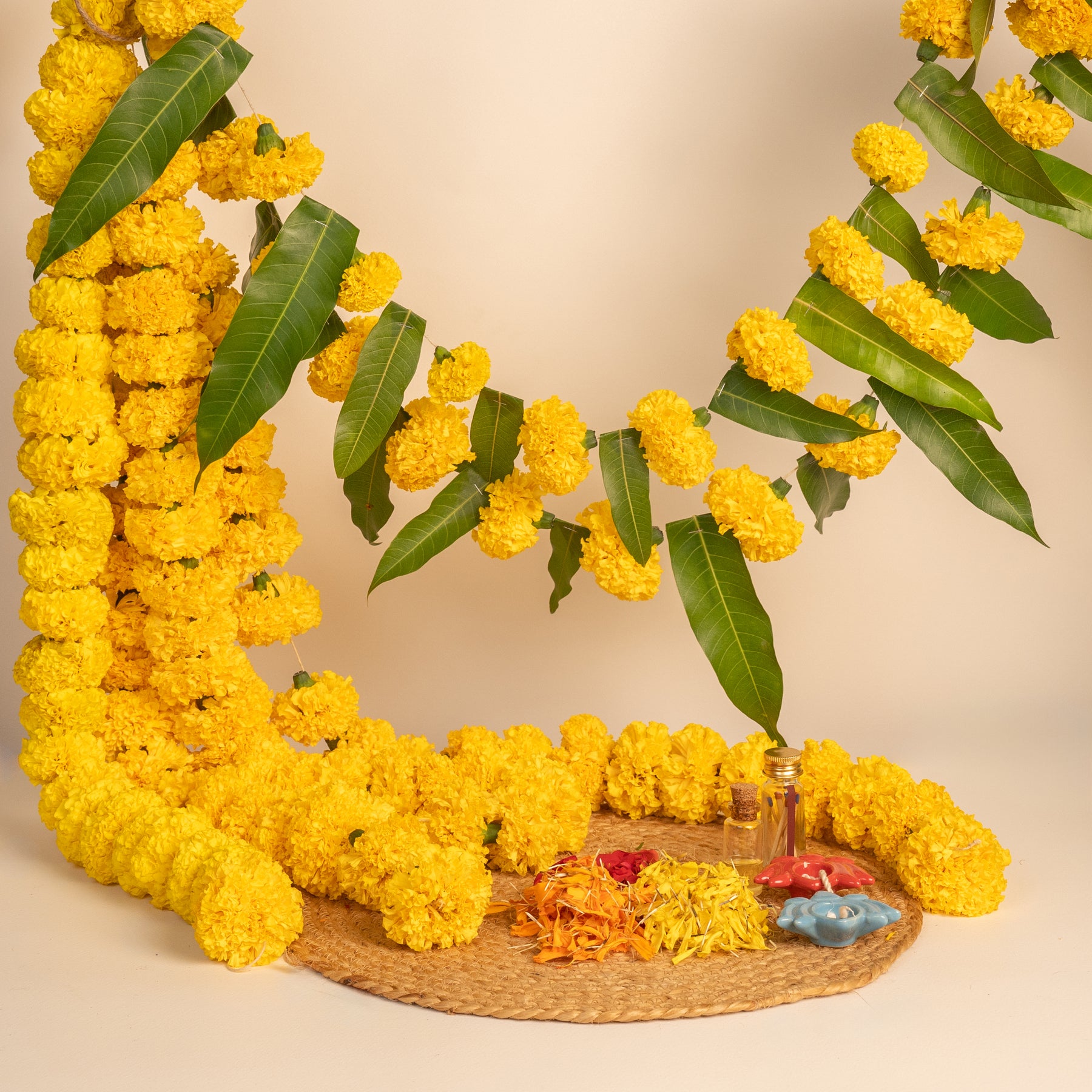Includes: Marigold strings, Marigold & mango leaf strings, loose marigold petals, 2 lotus diya with wick , Match stick & Oil