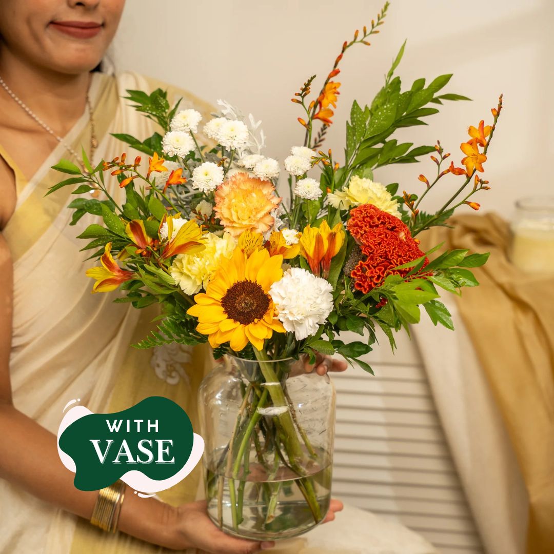 A timeless arrangement that blends vibrant blooms with classic charm, beautifully presented in an elegant vase. This floral set captures the essence of tradition while adding a fresh, festive touch to your celebrations or home decor.
